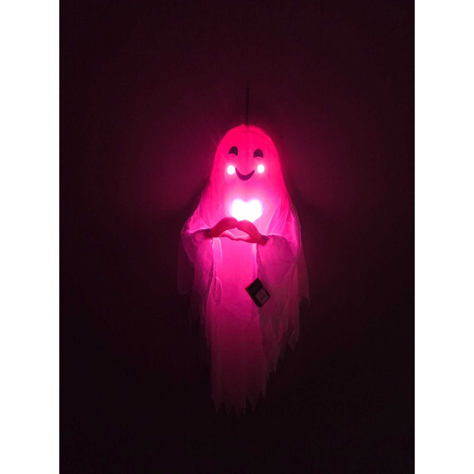 Ensure your Halloween decor leaves a lasting impression on the guests by adding the 42-Inch Beating Heart Ghost Halloween Decorative Prop from Hyde and EEK! Boutique™. This white decorative prop showcases a smiling ghost forming a heart with its hands. The prop also has a beating heart light effect for a creepy look. Made of plastic, this ghost decorative prop is great for indoor or sheltered outdoor display and requires batteries for operation.
