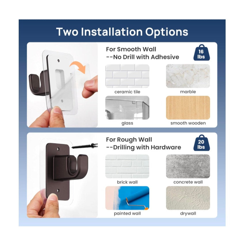 Load Bearing: Our no-drill curtain rods can hold up to 16 lbs without drilling, making them more suitable for light curtains. For better load-bearing, you can also drill it with our screws and anchors that are equipped for drywall, cement, painted walls, and wallpaper, which can hold up to 20 lbs.