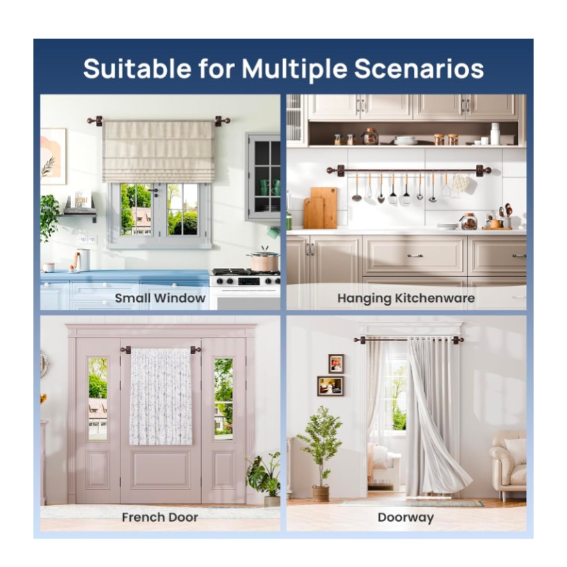 Adjustable Curtain Rod: With new splicing and telescoping design, these bronze curtain rods for windows can extend from 27 to 65 inches. Come with 3 fixed-length rods and 1 telescoping rod, so you can flexibly adjust the length.