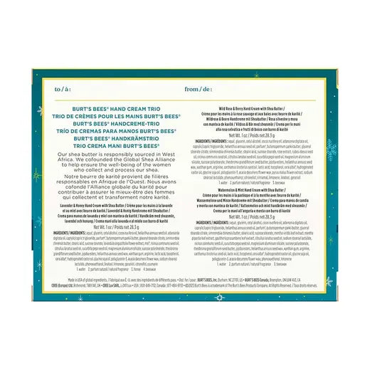 Lavender & Honey Hand Cream With Shea Butter Aqua¹, Glycerin, Cetyl Alcohol, Cocos Nucifera Oil, Helianthus Annuus Seed Oil, Adansonia Digitata Oil, Caprylic/capric Triglyceride, Parfum², Butyrospermum Parkii Butter, Simmondsia Chinensis Butter, Glyceryl Stearate Citrate, Stearic Acid, Sucrose Stearate, Lavandula Angustifolia Flower Extract, Mel³, Theobroma Grandiflorum Seed Butter, Cera Alba4, Ricinus Communis Seed Oil, Citrullus Lanatus Seed Oil, Cucurbita Pepo Seed Oil, Acacia Decurrens Flower Wax, Helianthus Annuus Seed Wax, Tocopherol, Jojoba Esters, Hydrogenated Castor Oil, Glycine Soja Oil, Polyglycerin-3, Biosaccharide Gum-1, Glyceryl Caprylate, Sodium Anisate, Sodium Levulinate, Sodium Stearoyl Lactylate, Magnesium Aluminum Silicate, Sucrose Polystearate, Xanthan Gum, Arginine, Lactic Acid, Phenoxyethanol, Citronellol, Coumarin, Geraniol, Limonene, Linalool;watermelon & Mint Hand Cream With Shea Butter Aqua¹, Glycerin, Cetyl Alcohol, Cocos Nucifera Oil, Adansonia Digitata Oil, Caprylic/capric Triglyceride, Helianthus Annuus Seed Oil, Parfum², Butyrospermum Parkii Butter, Glyceryl Stearate Citrate, Simmondsia Chinensis Butter, Stearic Acid, Sucrose Stearate, Citrullus Lanatus Seed Oil, Citrullus Lanatus Seed Extract, Mentha Piperita Leaf Extract, Mentha Viridis Leaf Extract, Gaultheria Procumbens Leaf Extract, Sodium Stearoyl Lactylate, Ricinus Communis Seed Oil, Cucurbita Pepo Seed Oil, Magnesium Aluminum Silicate, Sucrose Polystearate, Theobroma Grandiflorum Seed Butter, Jojoba Esters, Helianthus Annuus Seed Wax, Xanthan Gum, Arginine, Carthamus Tinctorius Seed Oil, Lactic Acid, Tocopherol, Cera Alba³, Hydrogenated Castor Oil, Glycine Soja Oil, Polyglycerin-3, Acacia Decurrens Flower Wax, Biosaccharide Gum-1, Glyceryl Caprylate, Sodium Anisate, Sodium Levulinate, Phenoxyethanol, Limonene;wild Rose & Berry Hand Cream With Shea Butter Aqua¹, Glycerin, Cetyl Alcohol, Cocos Nucifera Oil, Adansonia Digitata Oil, Caprylic/capric Triglyceride, Helianthus Annuus Seed Oil, Parfum², Butyrospermum Parkii Butter, Glyceryl Stearate Citrate, Simmondsia Chinensis Butter, Stearic Acid, Sucrose Stearate, Fragaria Ananassa Seed Oil, Citrullus Lanatus Seed Oil, Cucurbita Pepo Seed Oil, Rose Extract, Carthamus Tinctorius Seed Oil, Ricinus Communis Seed Oil, Helianthus Annuus Seed Wax, Cera Alba³, Theobroma Grandiflorum Seed Butter, Hydrogenated Castor Oil, Glycine Soja Oil, Acacia Decurrens Flower Wax, Tocopherol, Jojoba Esters, Xanthan Gum, Sodium Stearoyl Lactylate, Magnesium Aluminum Silicate, Sucrose Polystearate, Arginine, Lactic Acid, Polyglycerin-3, Biosaccharide Gum-1, Glyceryl Caprylate, Sodium Anisate, Sodium Levulinate, Phenoxyethanol, Cinnamal, Citronellol, Geraniol, Limonene, Linalool