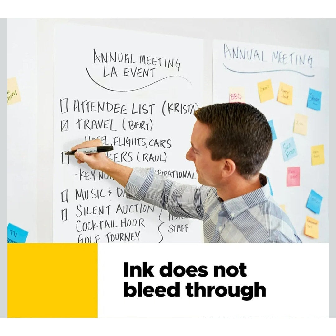 INK BLEED-THROUGH RESISTANT PAPER - Small white premium self-stick flip chart paper that resists marker bleed-through to keep great ideas on the page, not on what's under the page