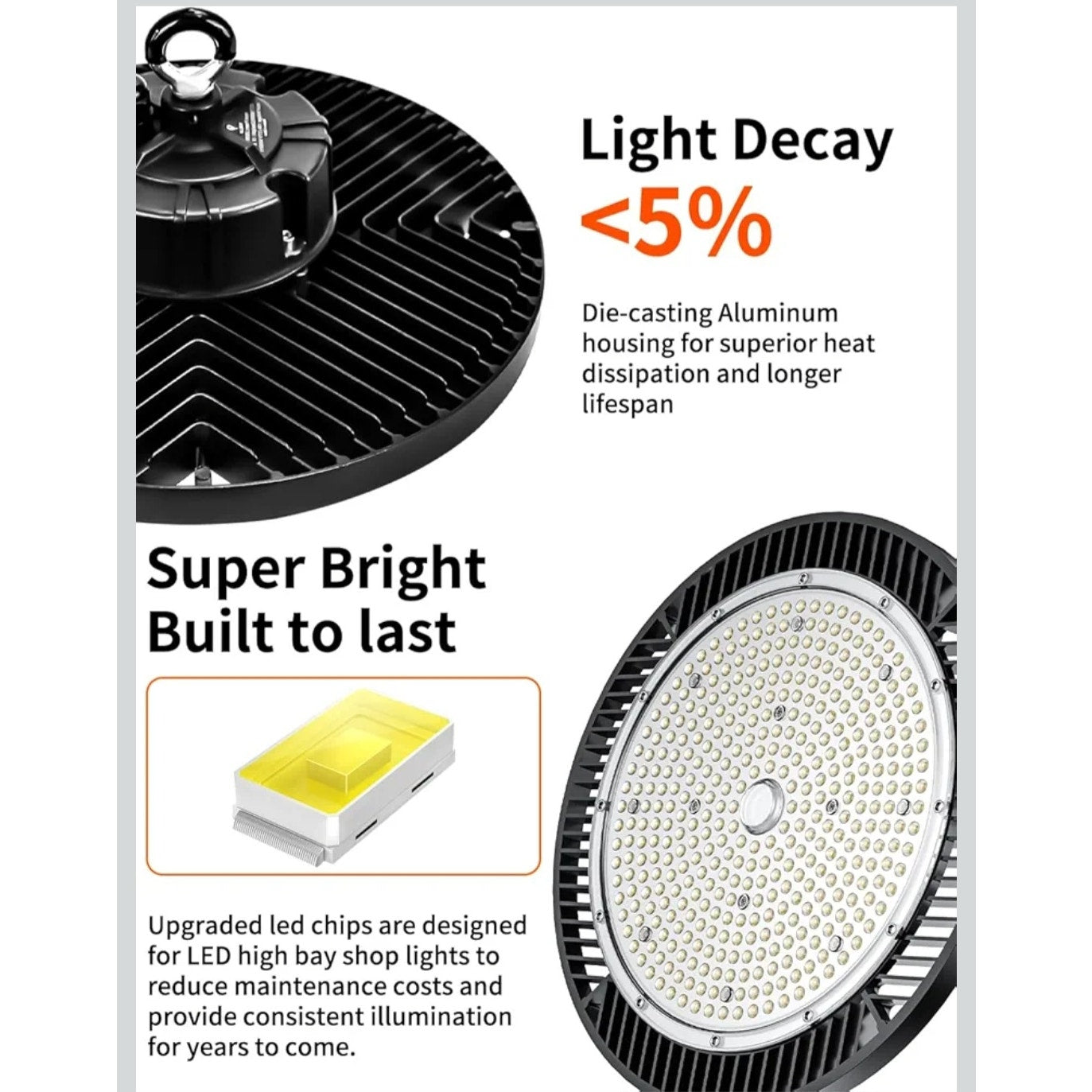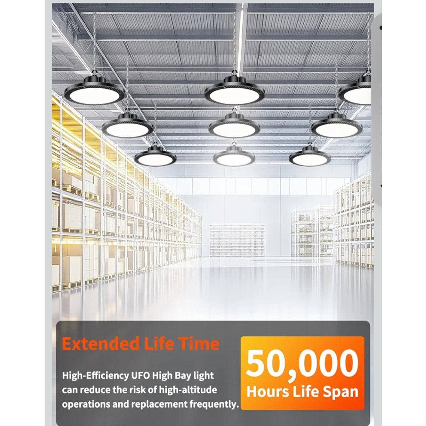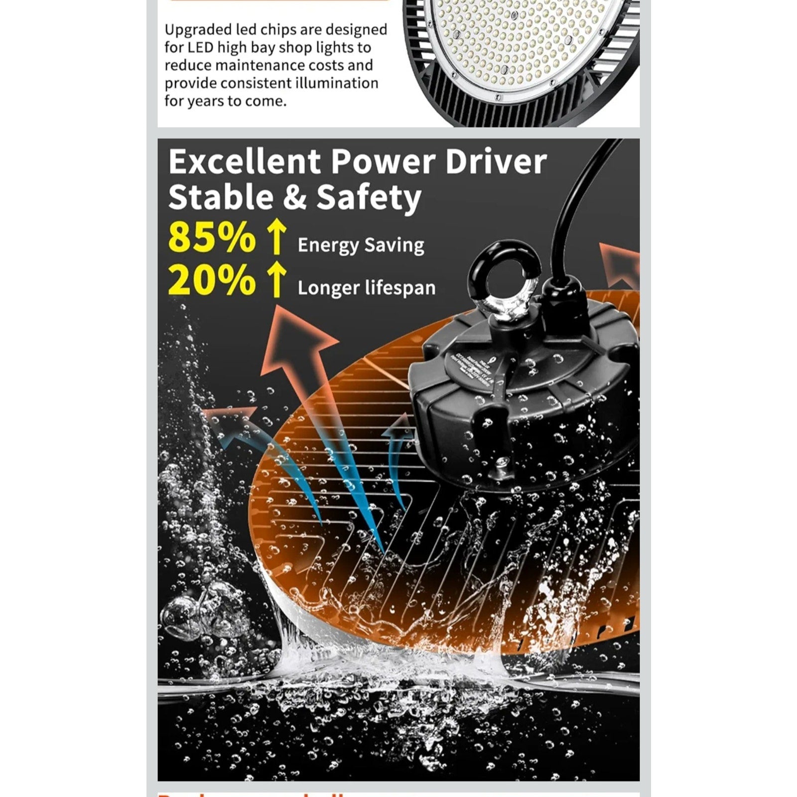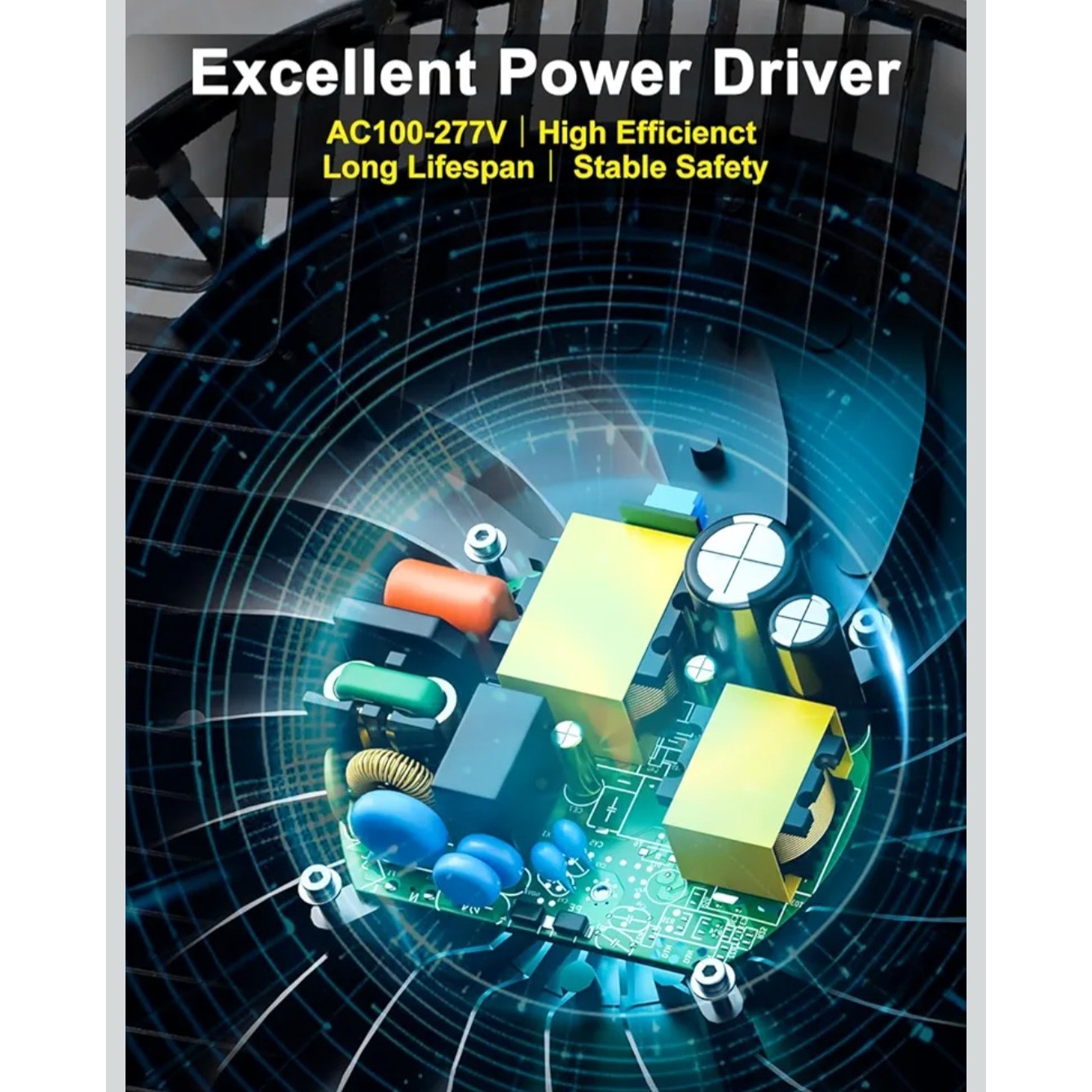 Durable Upgraded Driver& 5 Years Warranty. This high bay LED shop light adopts high quality non-flickering driver to guarantee it can work under AC100-277V, with an excellent heat dissipation heat sink design, it can ensure the lifetime is up to 50000hrs.