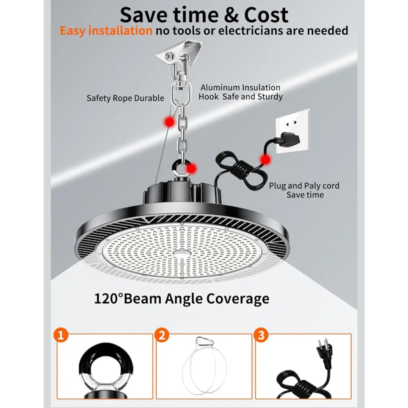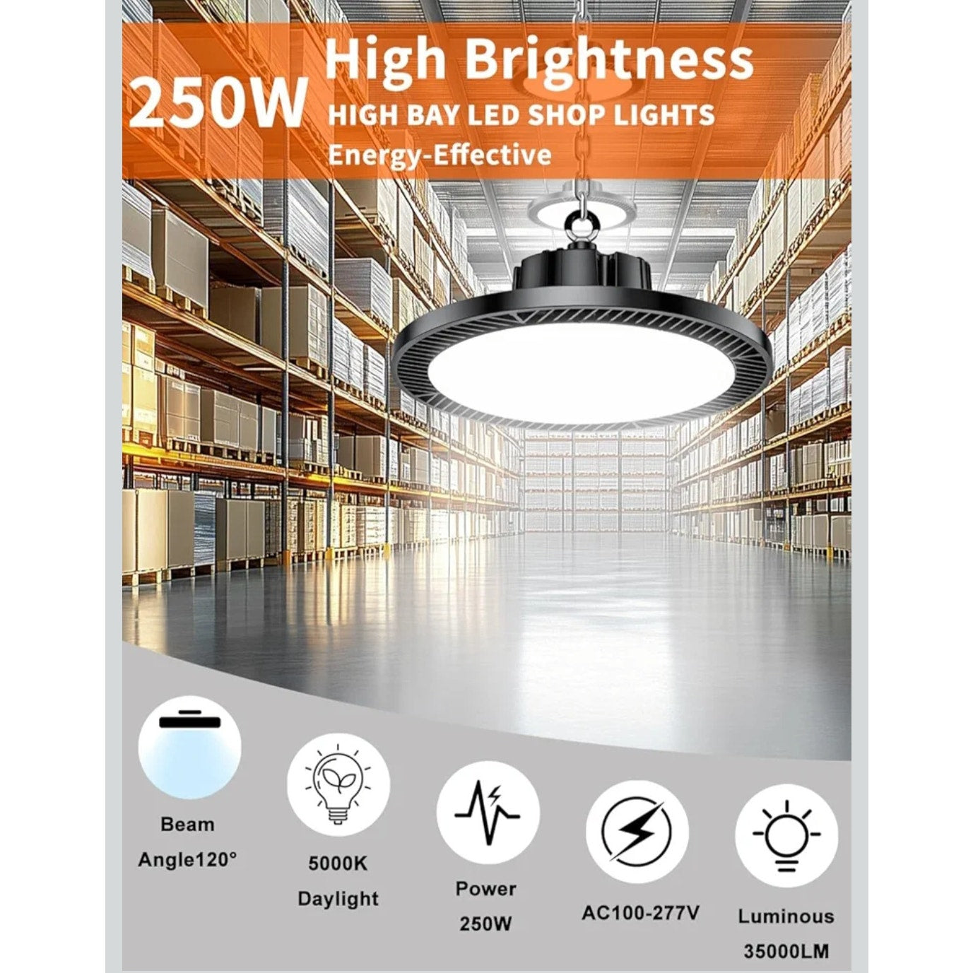 This 250W LED high bay light has super high brightness, 35,000 lumens, a color temperature of 5000K, CRI80, which is closest to natural light and friendly to your eyes. Itsa a 120° big beam angle to offer you the best lighting experience.