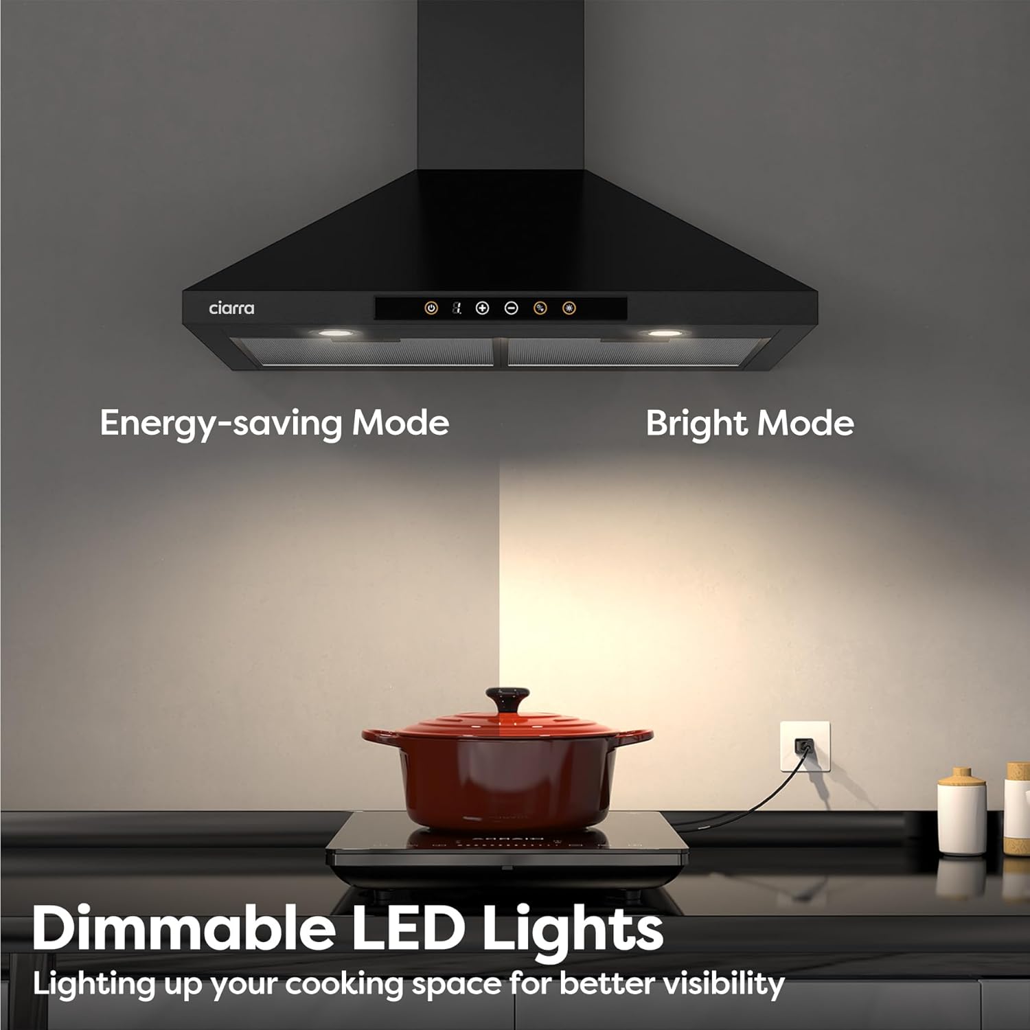 INTEGRATED LED LIGHTING: Stove vent hood equipped with a bright, 2-level dimmable LED module to evenly illuminate your cooking area, controlled by a soft touch for ease of use.