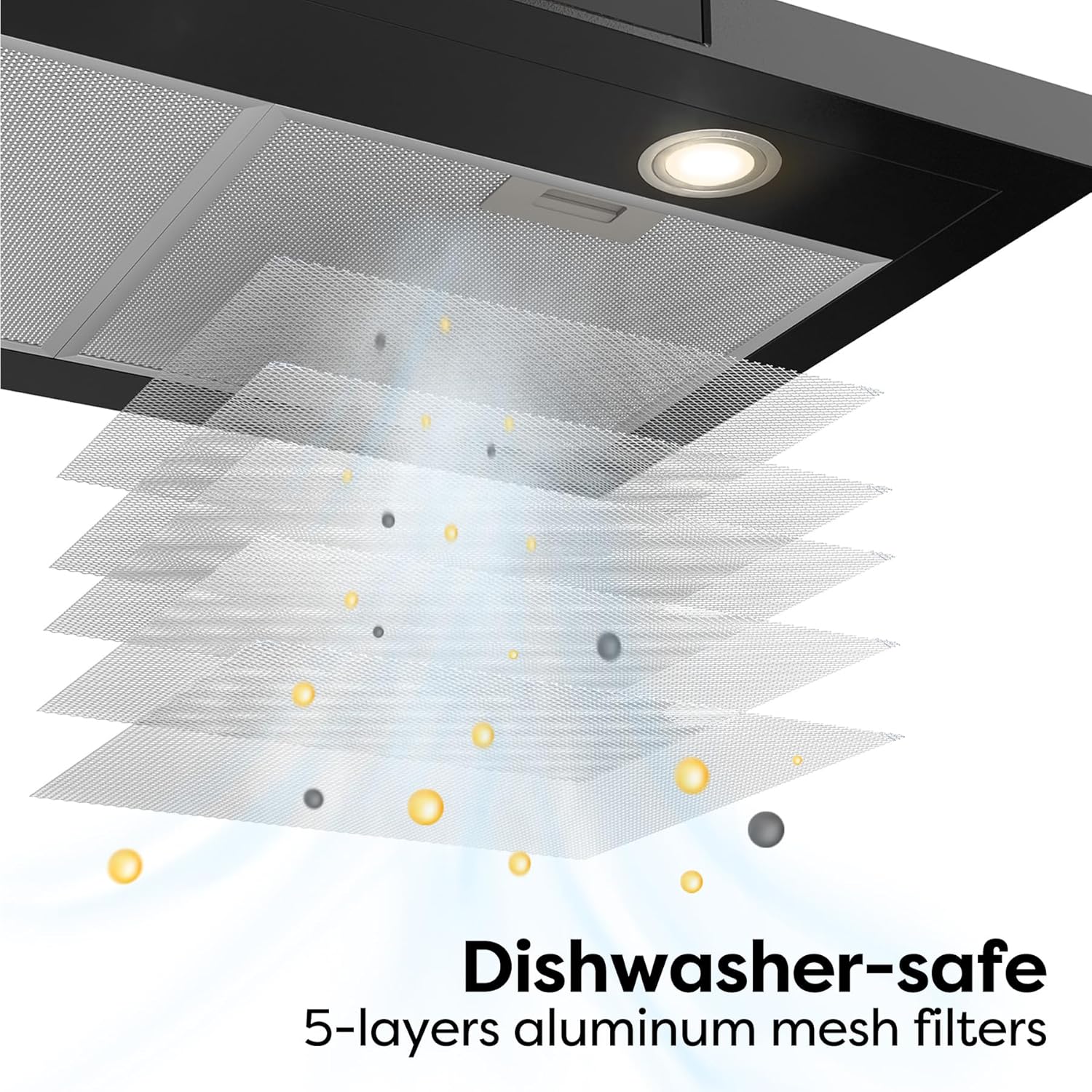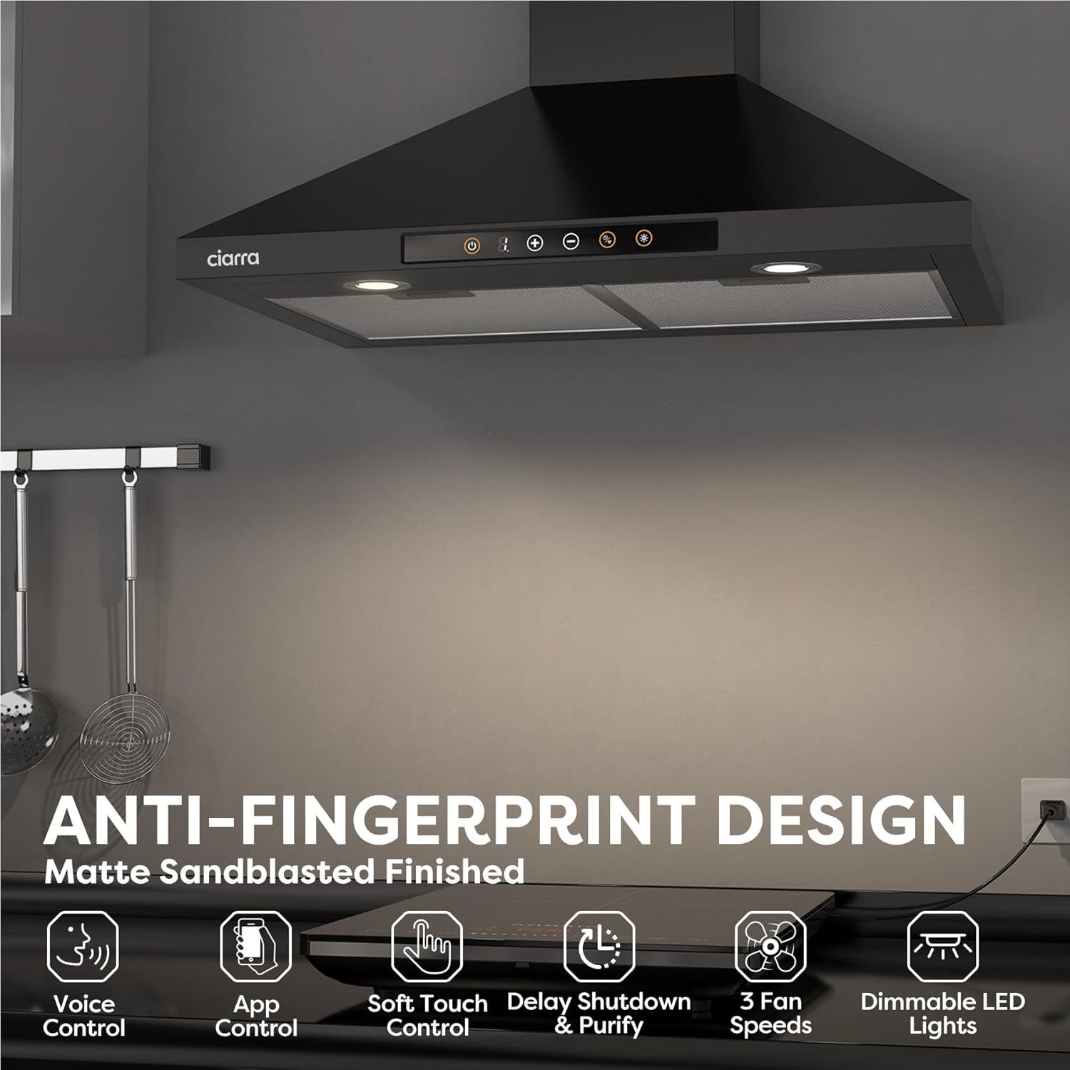 ANTI-FINGERPRINT PAINTING: Black range hood with matte sandblasted finish, scratch-resistant, and easy cleaning.