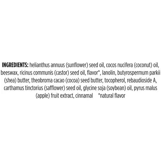Helianthus Annuus (Sunflower) Seed Oil, Cocos Nucifera (Coconut) Oil, Beeswax, Ricinus Communis (Castor) Seed Oil, Flavor*, Lanolin, Butyrospermum Parkii (Shea) Butter, Theobroma Cacao (Cocoa) Seed Butter, Tocopherol, Rebaudioside A, Carthamus Tinctorius (Safflower) Seed Oil, Glycine Soja (Soybean) Oil, Pyrus Malus (Apple) Fruit Extract, Cinnamal *Natural Flavor