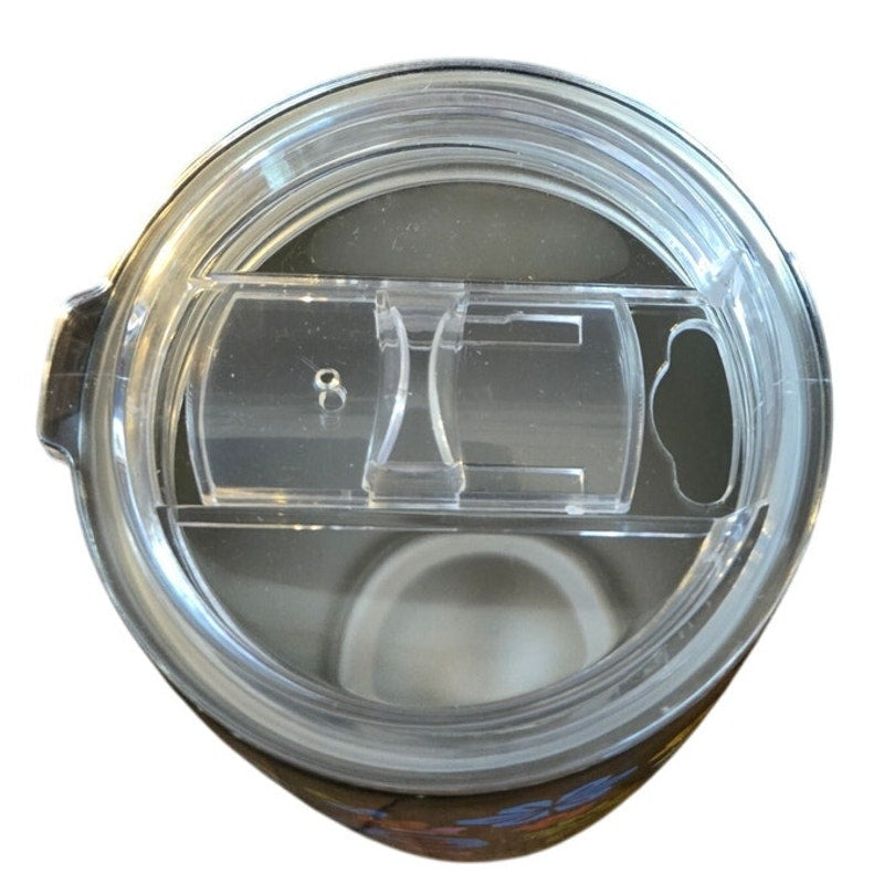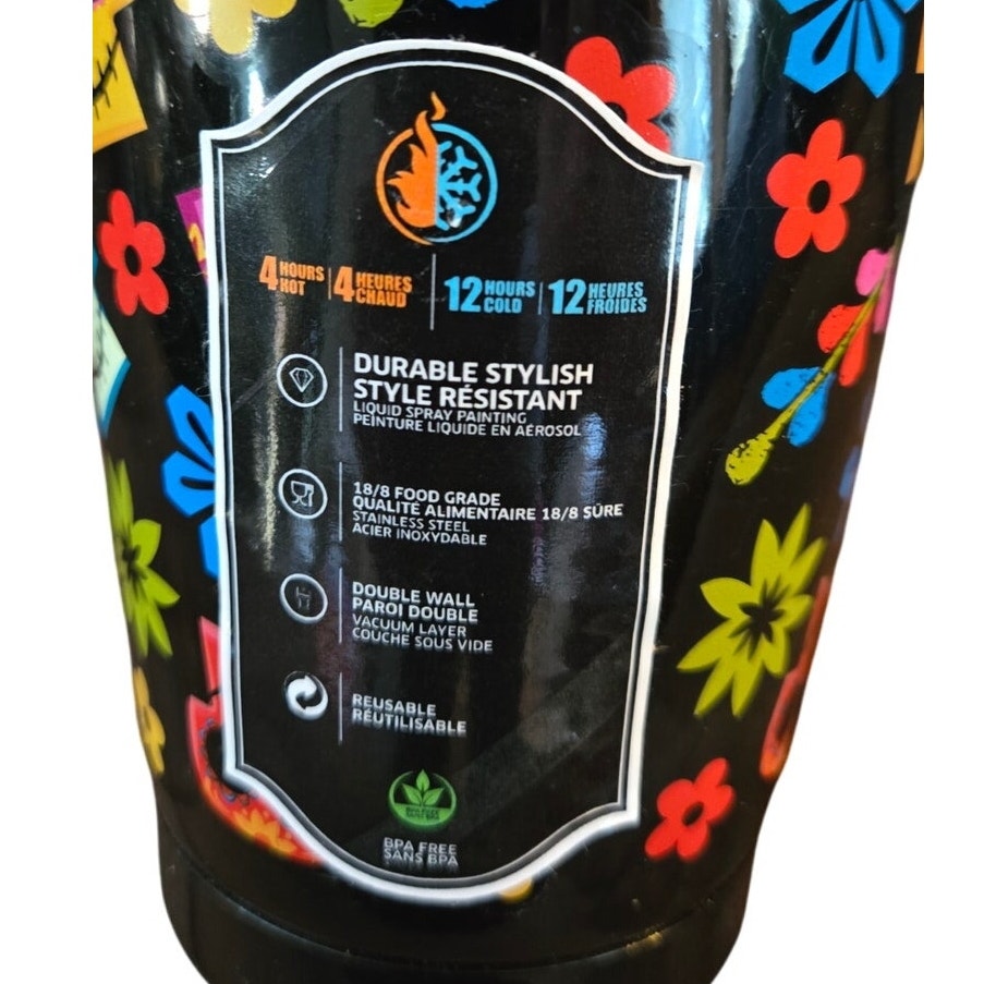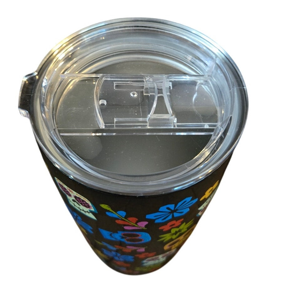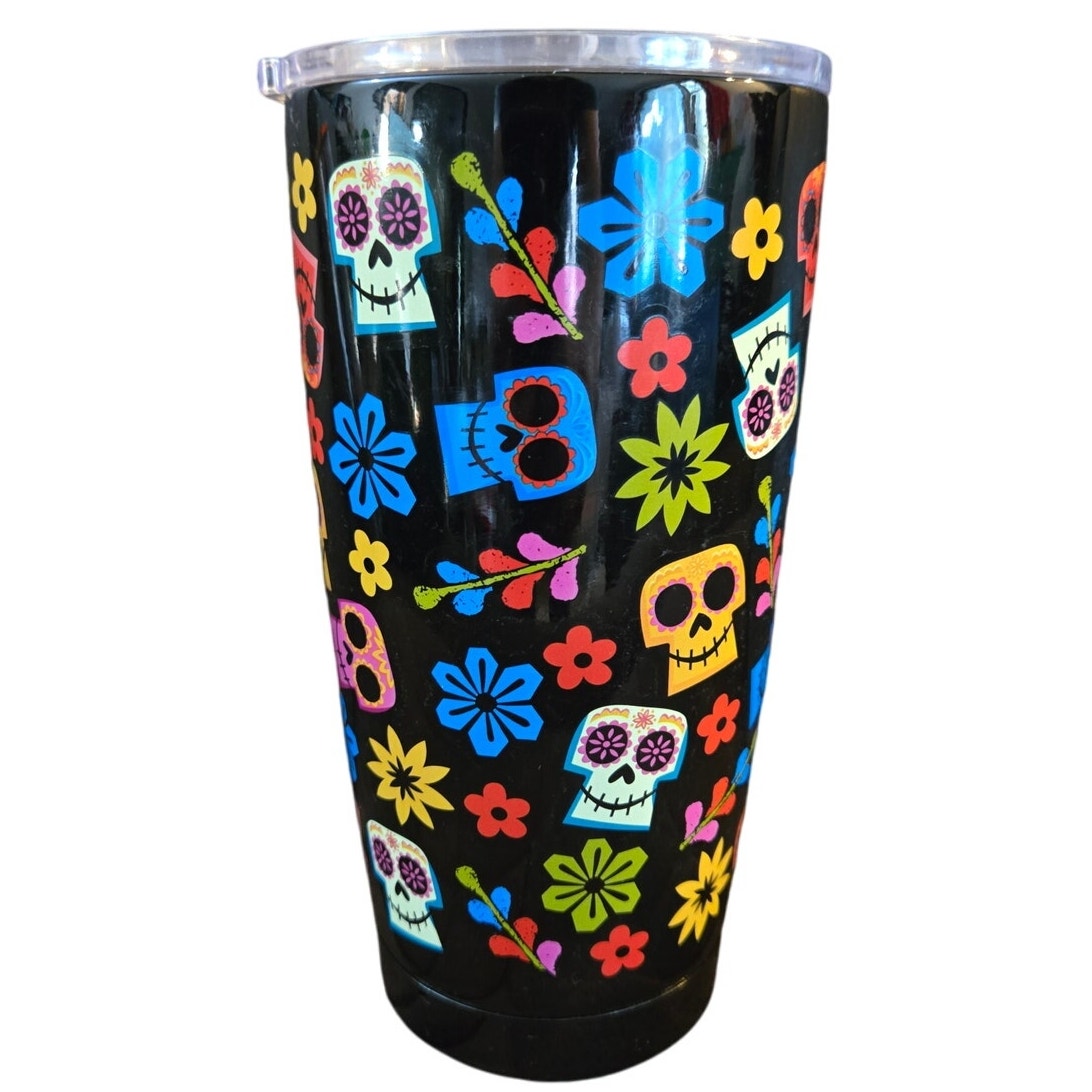 Adorable travel mug perfect for Halloween! Features colorful sugar skulls and flowers all over on a black background. Insulated for or hot or cold beverages. Stainless Steel.