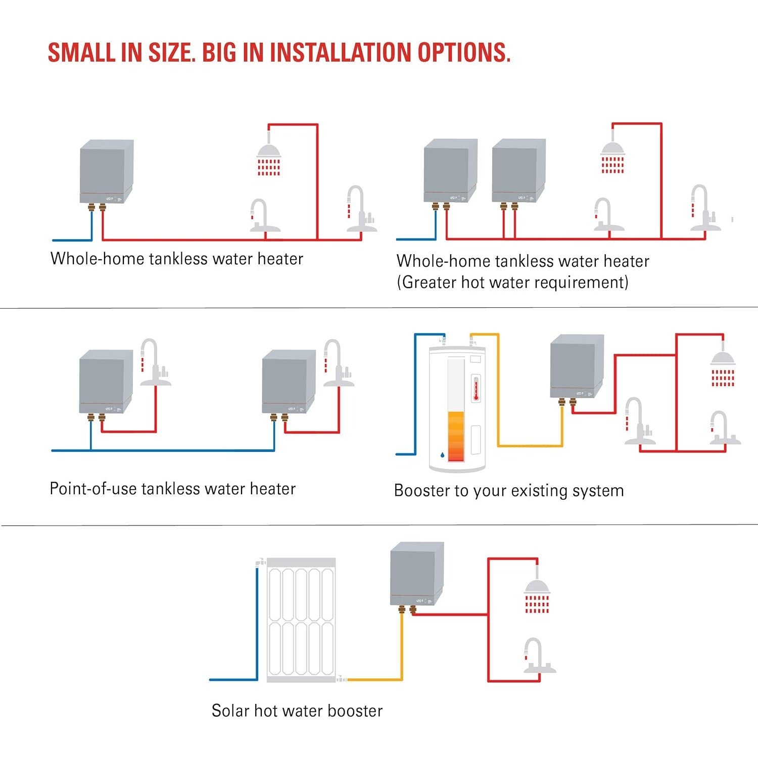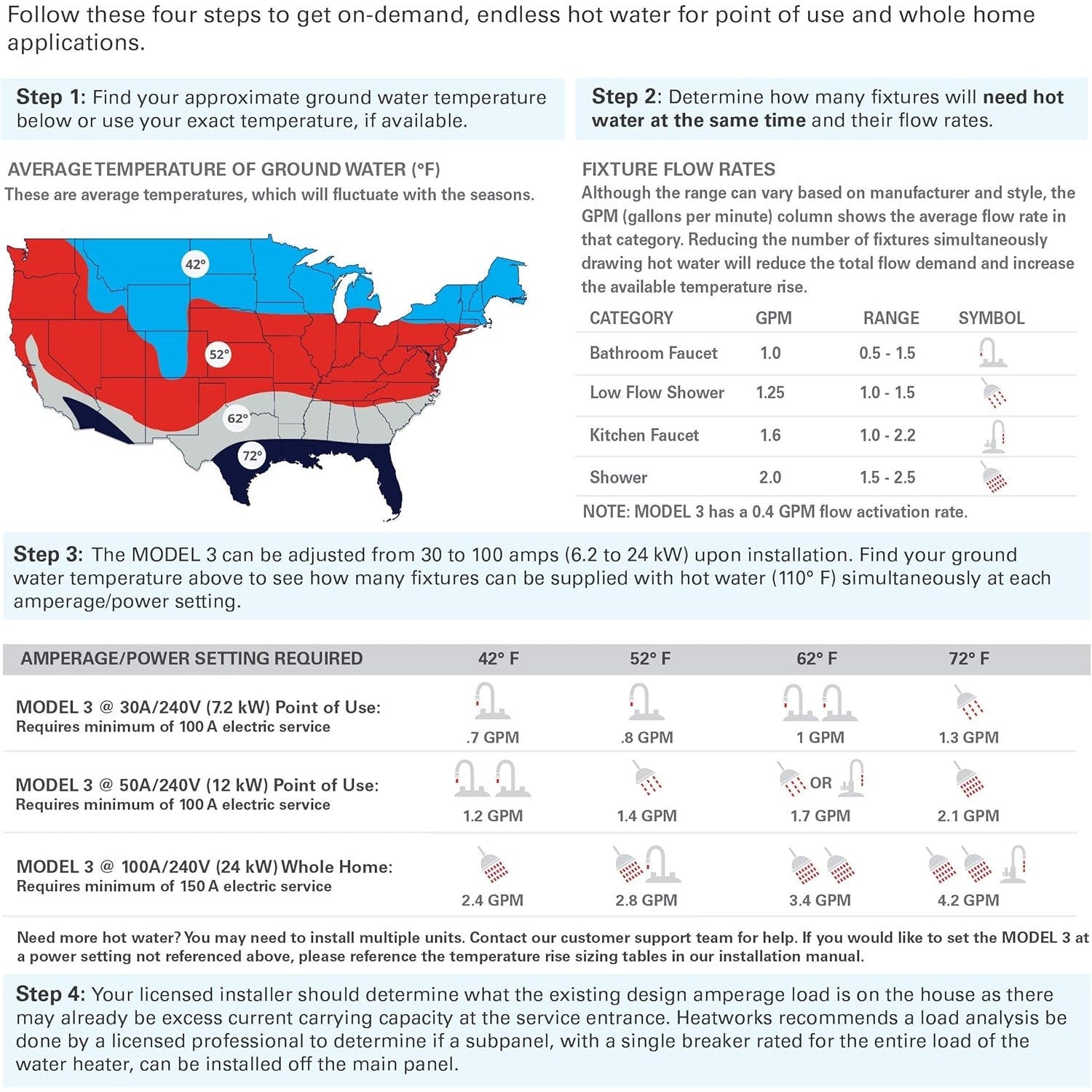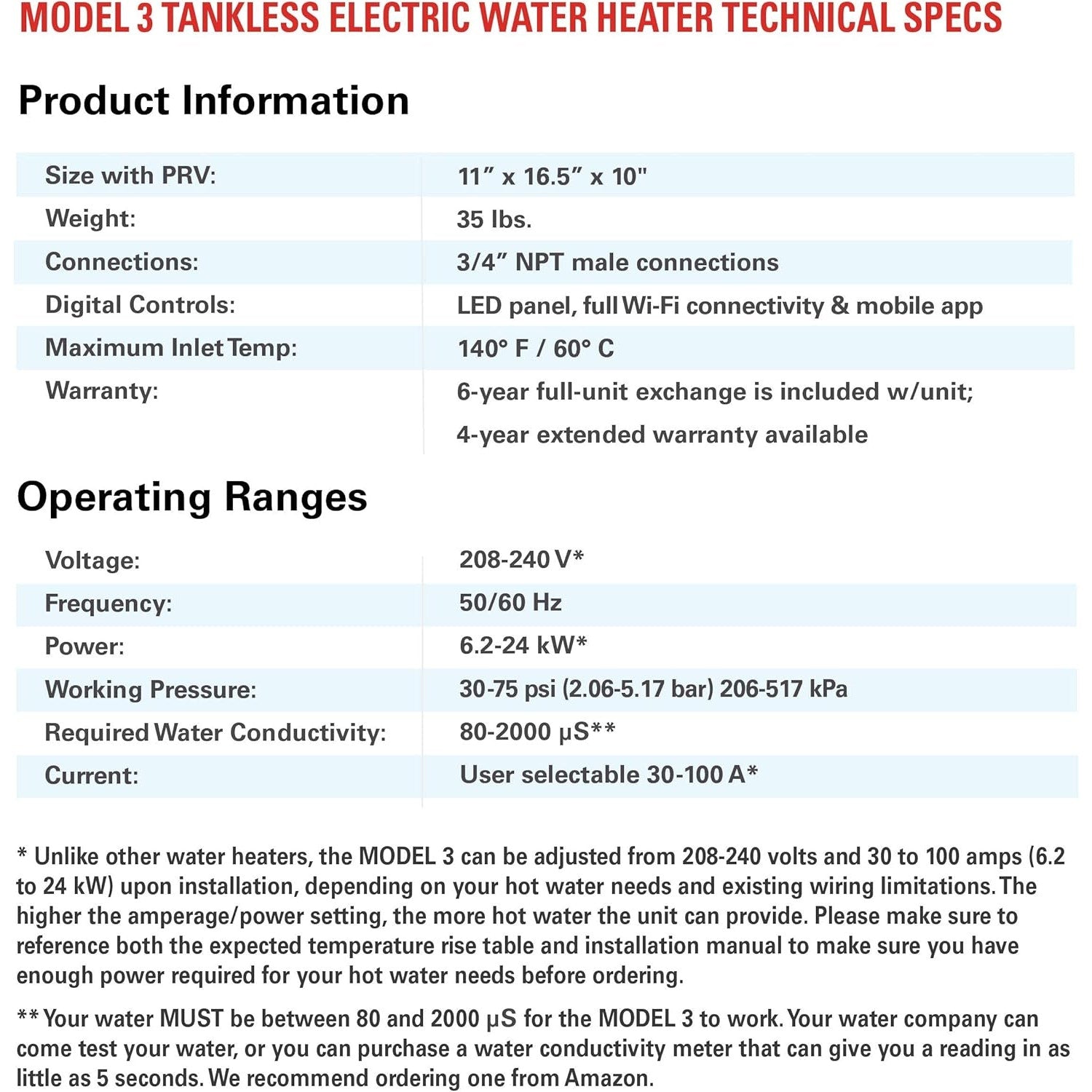 Electric Tankless Smart Water Heater, the world’s only water heater without metal heating elements. 6.2-24 kW (30-100 A, 208-240 V) Whole-Home or Point-of-Use