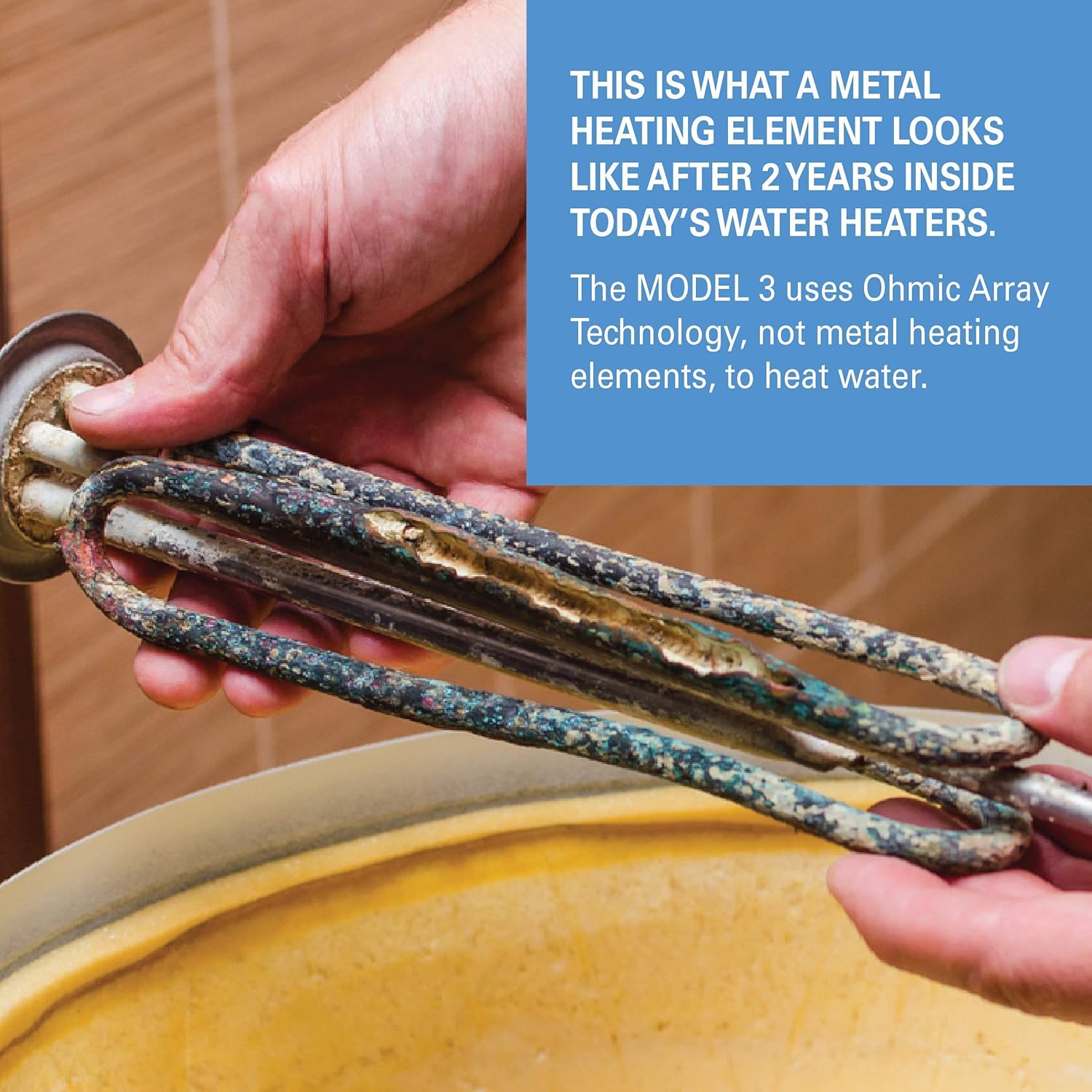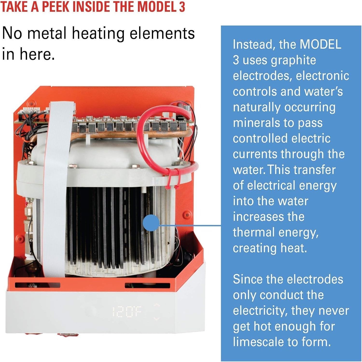You won't find metal elements inside. That 150-year-old technology has one fundamental flaw: the metal heating elements get very hot, and the minerals found in water stick to them. This causes energy efficiency loss, hot spots, and eventually, the elements will fail. Instead, the MODEL 3 uses electronic controls to pass controlled electric currents through the water. This transfer converts electrical energy into thermal energy, creating endless water on demand. At the temperature you want. And because no scale forms, there is never a loss of energy efficiency. No metal heating elements to replace. No maintenance.