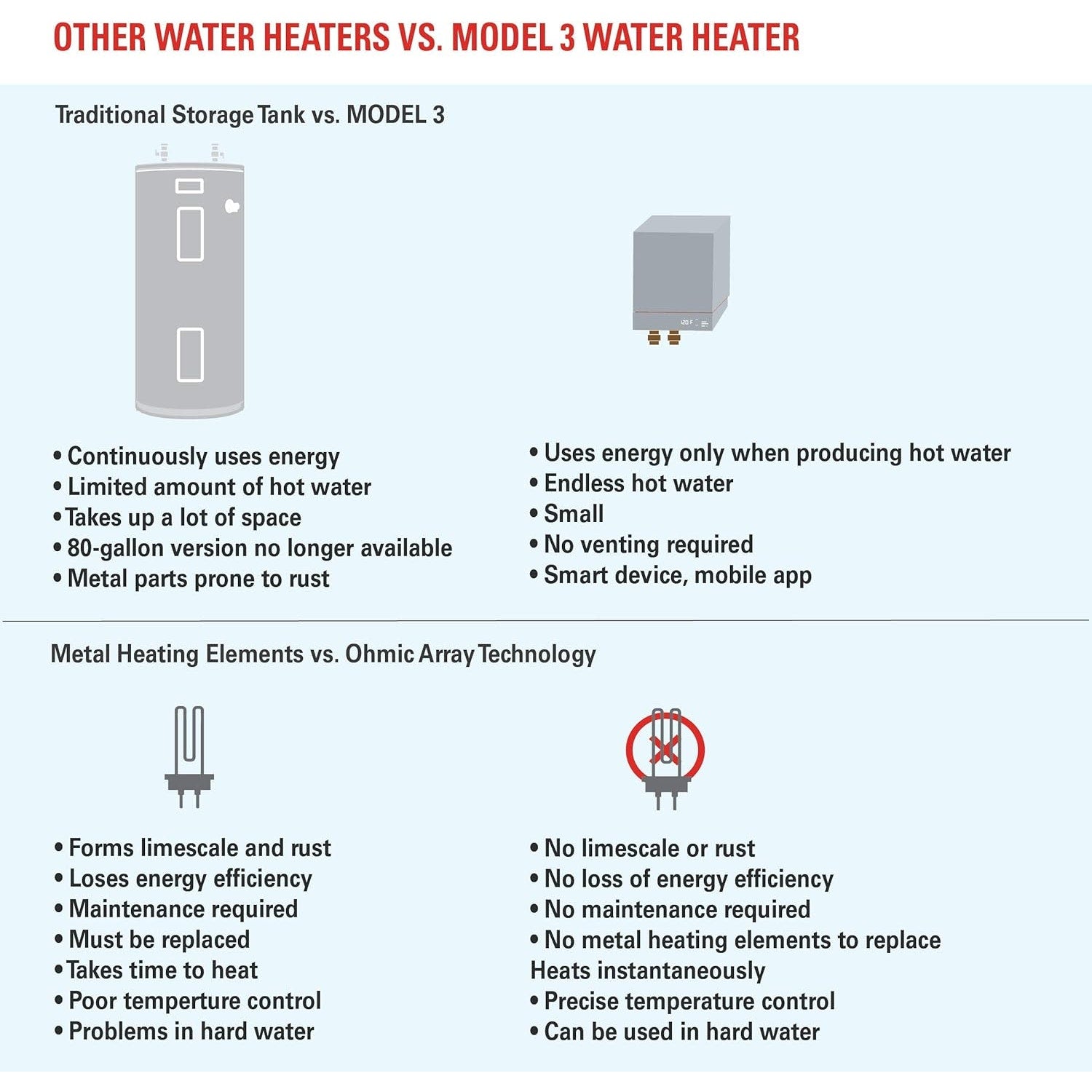 Powered by patented Ohmic Array Technology, the MODEL 3 is a smart, electric tankless water heater that provides endless hot water on-demand for whole house and point-of-use.
