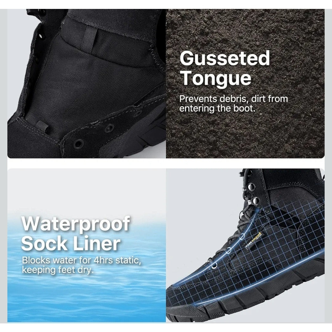These lightweight boots for men weigh about 1.54 lb, super lightweight. Gusseted tongue prevents pebbles, sand, dirt, and other debris from entering these tactical boots. Durable lace and quick fasten-up, convenient men's work boots