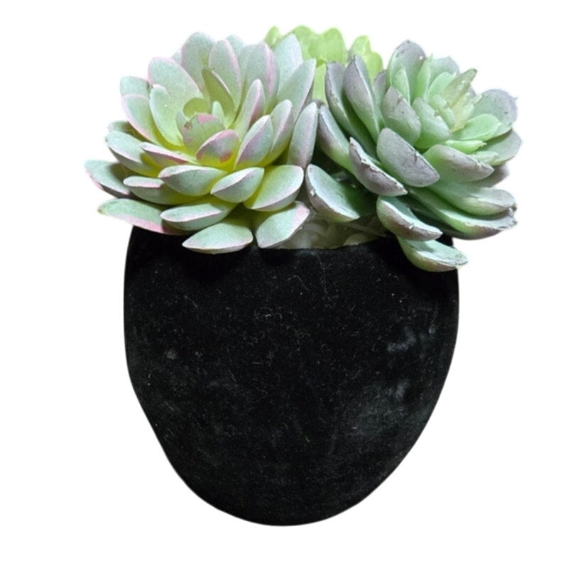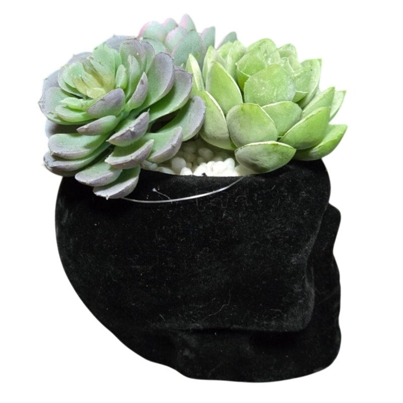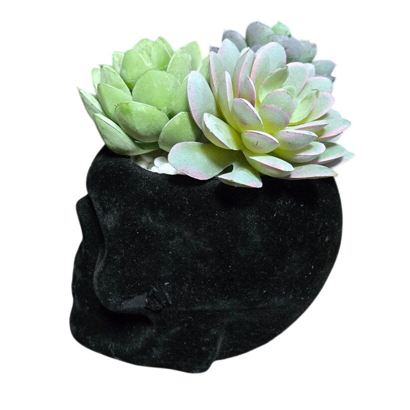 Flocked Black Skull Planter w/ 3 Artificial Succulents. New - no tags.