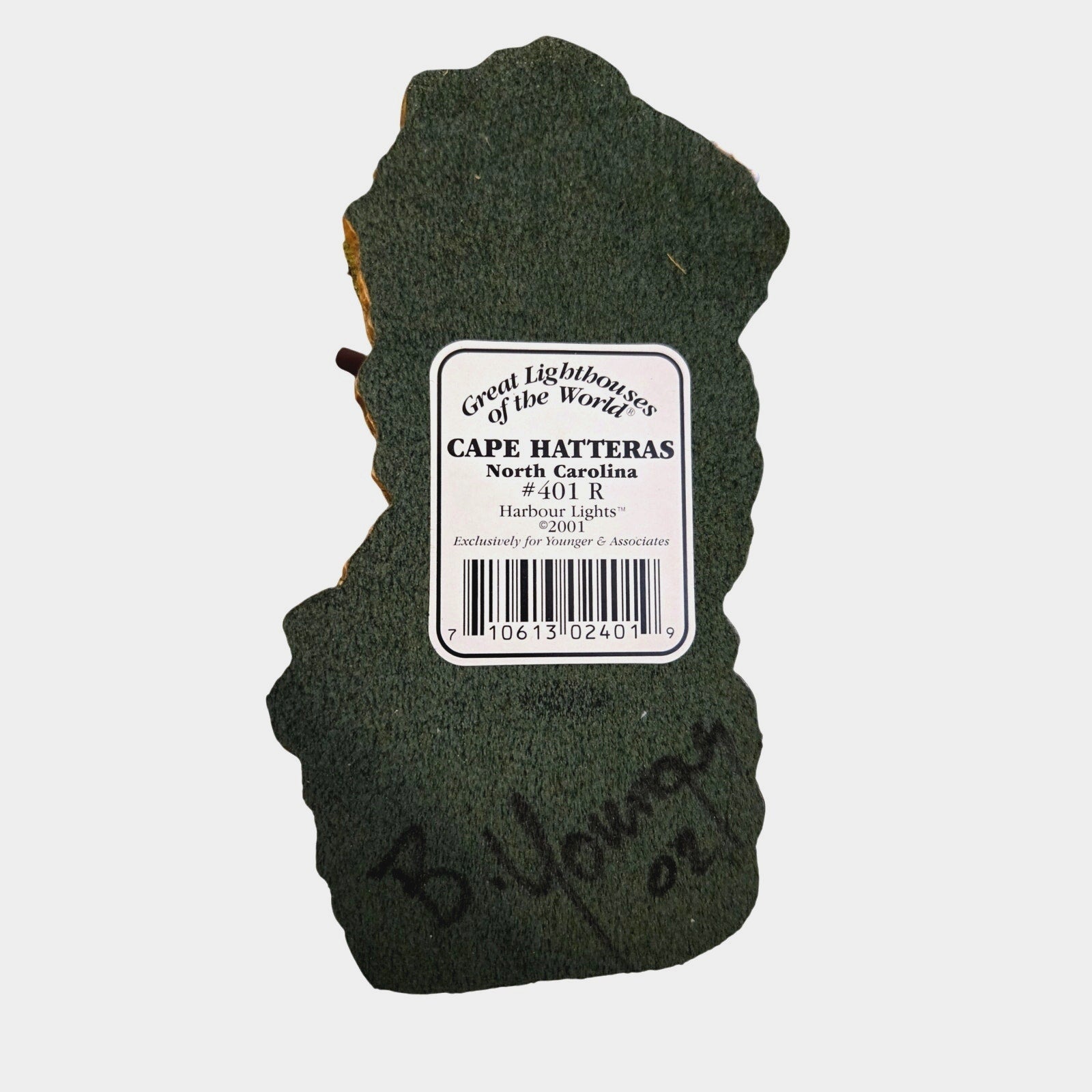 Beautiful Harbour Lights collectible featuring the iconic Cape Hatteras Lighthouse! This piece comes with its original Certificate of Authenticity, adding to its value and collectibility. Autograph signature on the bottom by Bill Younger.