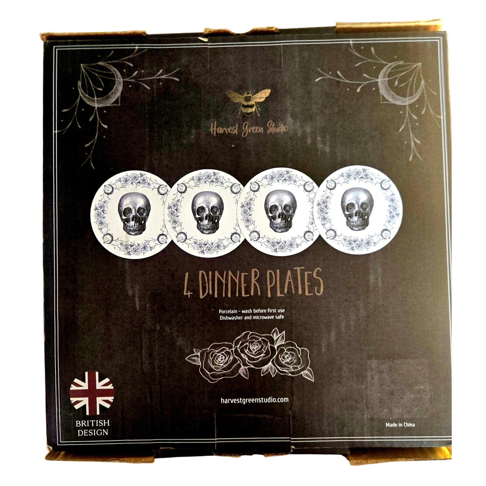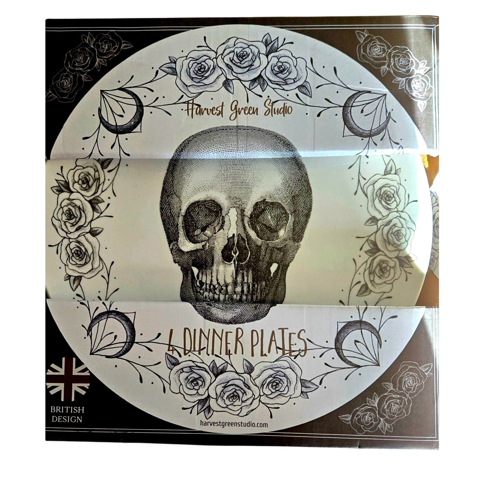 The Harvest Green Studio 4 SKULL & ROSES 10.5" Dinner Plates are a set of four porcelain plates featuring a dark gray skull and rose design, perfect for Halloween or the Day of the Dead. Made in China, these glossy finished plates are 10 1/2 inches wide, ideal for serving meals to guests. With a horror style and British design, these dinner plates are a unique addition to any tableware collection, adding a touch of edgy sophistication to your dining experience.