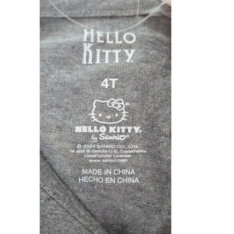 This girls' dress features a charming Hello Kitty graphic print on a soft gray top with a tulle skirt adorned with allover Hello Kitty silhouettes.