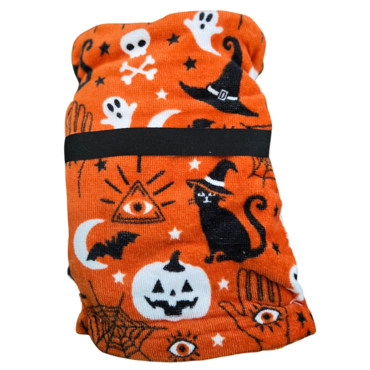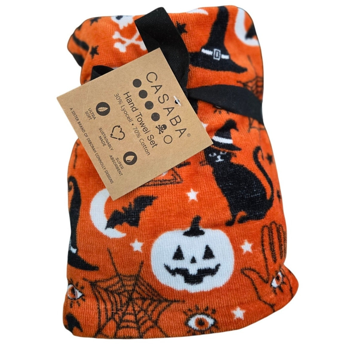 The new Halloween Hand Towel Set of 2 features an orange background and includes a variety of Halloween-themed designs, such as a Black Cat, Witch Hat, Ghost, Pumpkin, Jack-O-Lantern, Bat, Spider Web, Skull & Crossbones, and more, all printed in an all-over design.