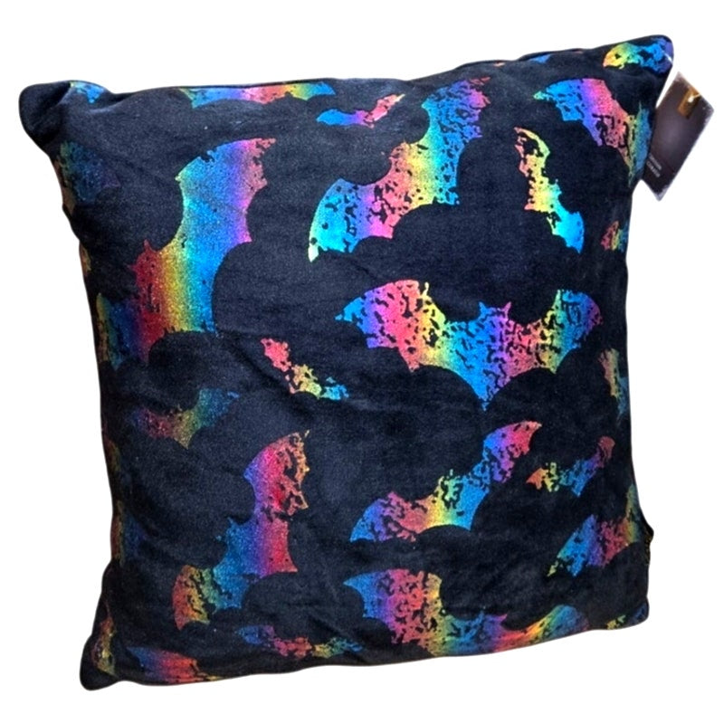 NEW Halloween Throw Pillow Black w/ Rainbow Iridescent Bats 10"x10" Plush Decor
