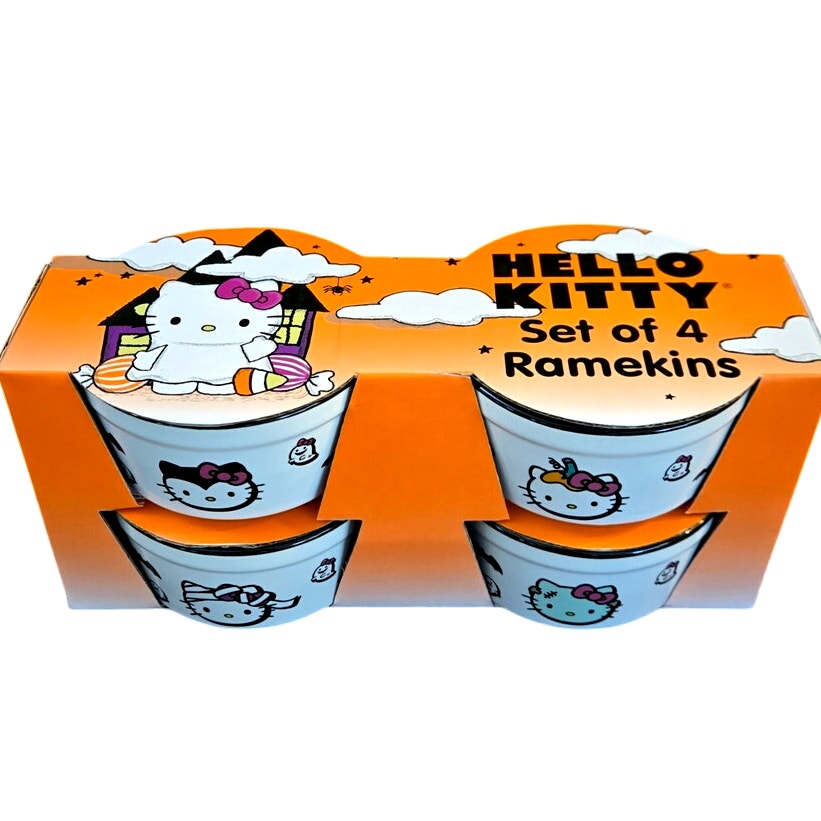 This set of four ceramic round ramekins features a cute and spooky Hello Kitty and Friends Halloween Costumes design. The white ramekins are perfect for baking and serving your favorite treats, and the set includes a baking dish and ramekin. The Hello Kitty brand adds a touch of fun to your baking experience, making it perfect for kids and adults alike. The ramekins are durable and easy to clean, ensuring that you can use them for many Halloweens to come. Add some festive flair to your kitchen with this charming set.