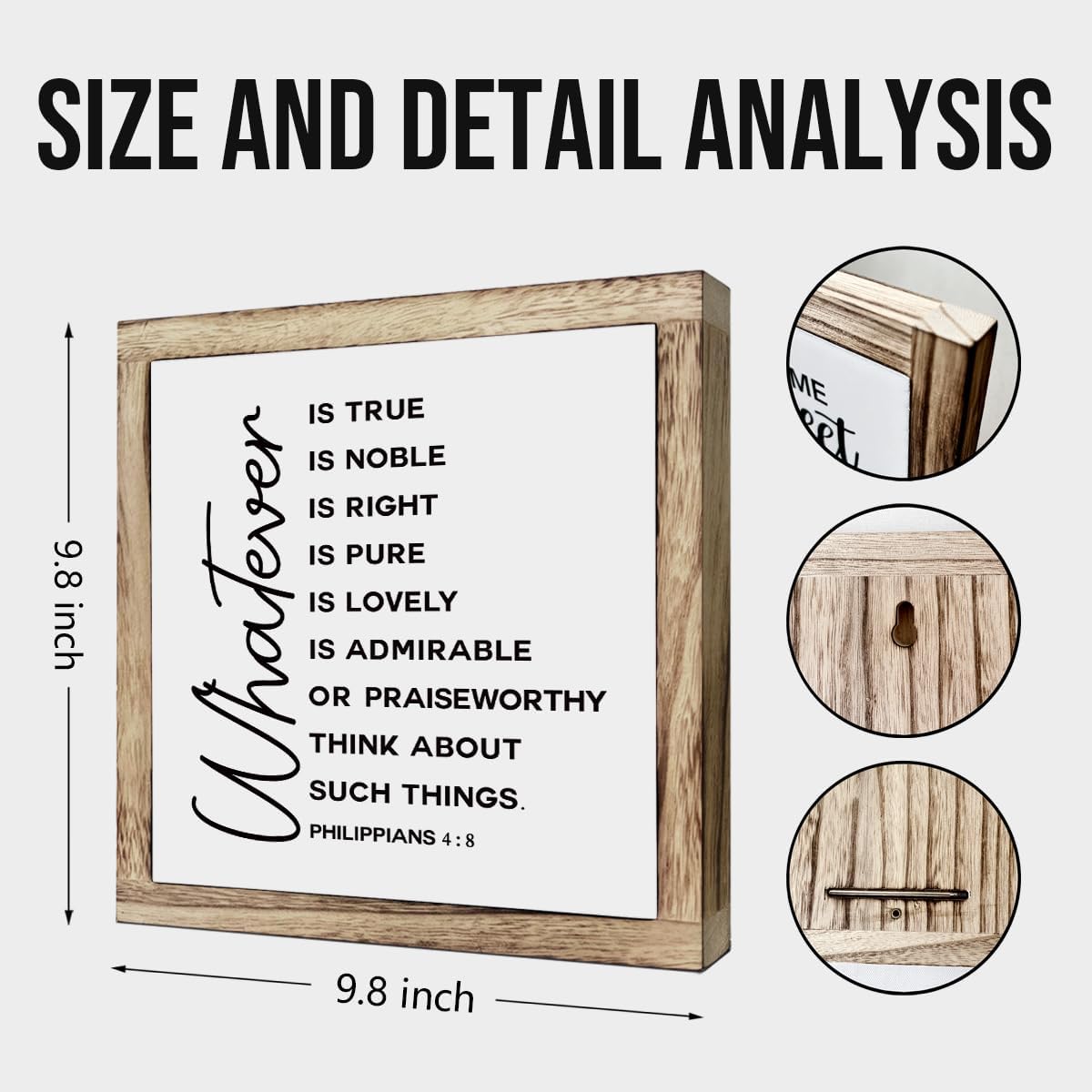 The sign is about 9.8x9.8 inches in size and features Philippians 4:8 Bible verse.