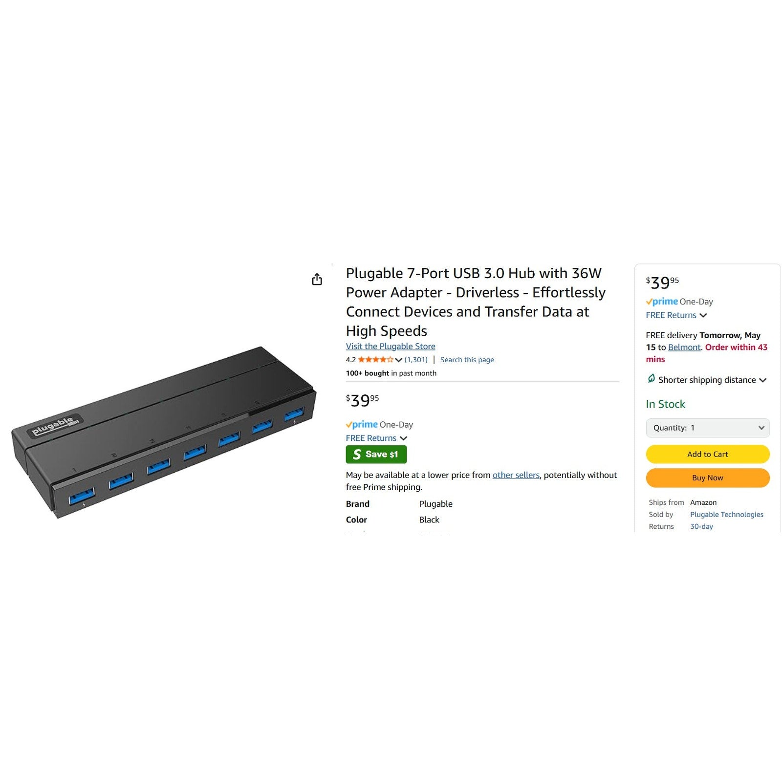 Resellers Lot - 98 ct sealed - plugable 7 Port Hub USB 3.0 w/ Dual Charging Ports Superspeed 5Gbps 36W 36 Watt