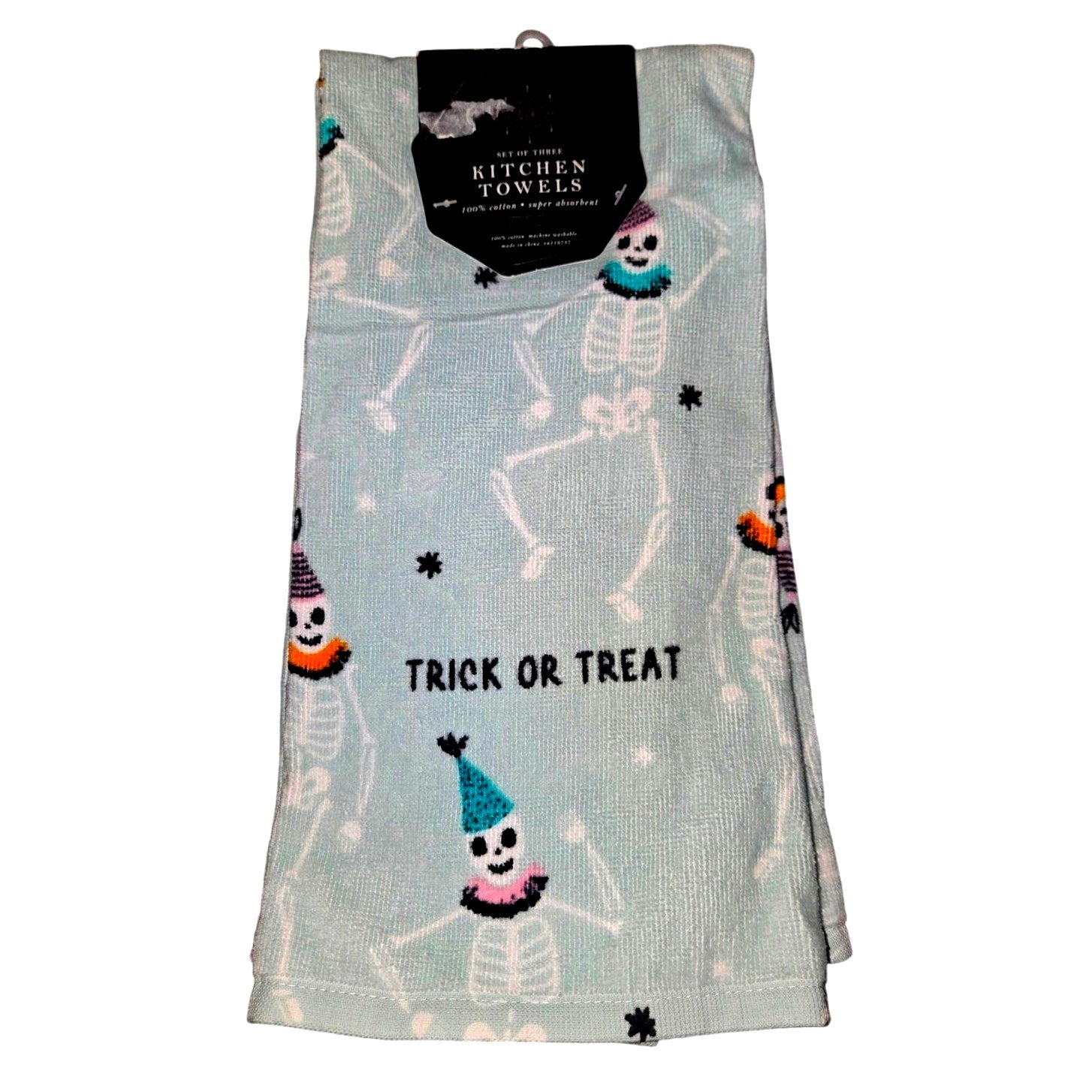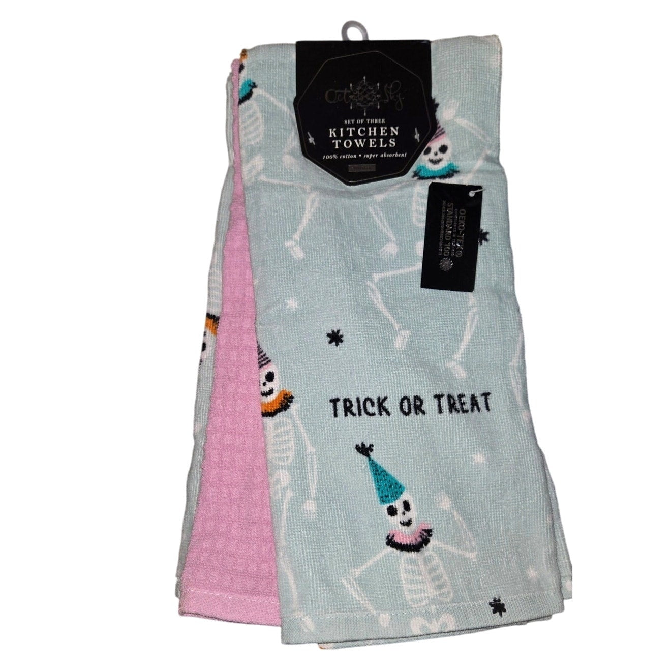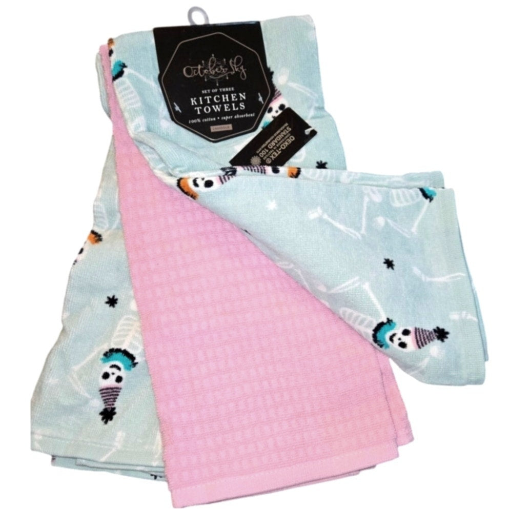 Set of 3 October Sky Halloween Skeleton Kitchen Towels Trick or Treat NEW with tags