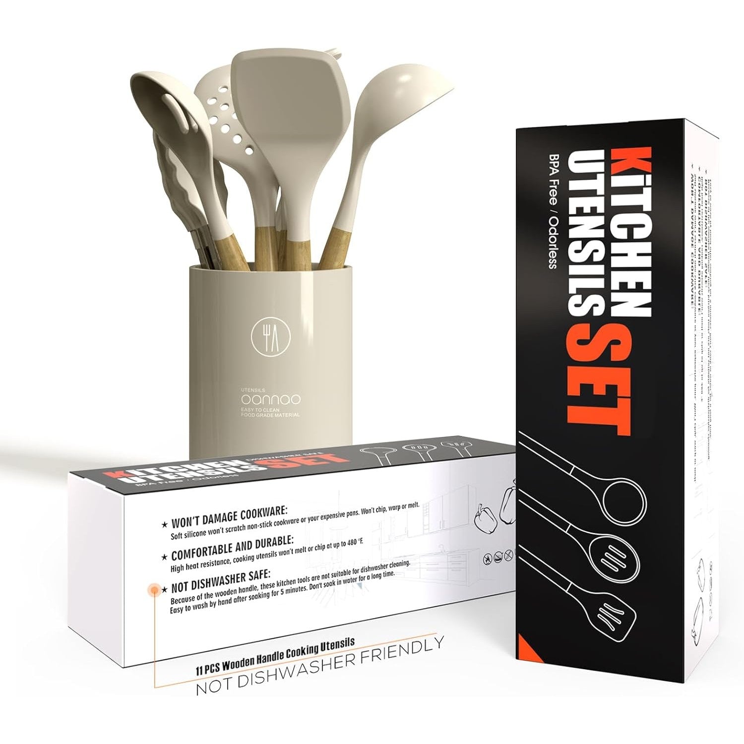 Silicone Kitchen Cooking Utensils Set Spoon Ladle Spatula Set w Wooden Handles Non-Stick Cookware