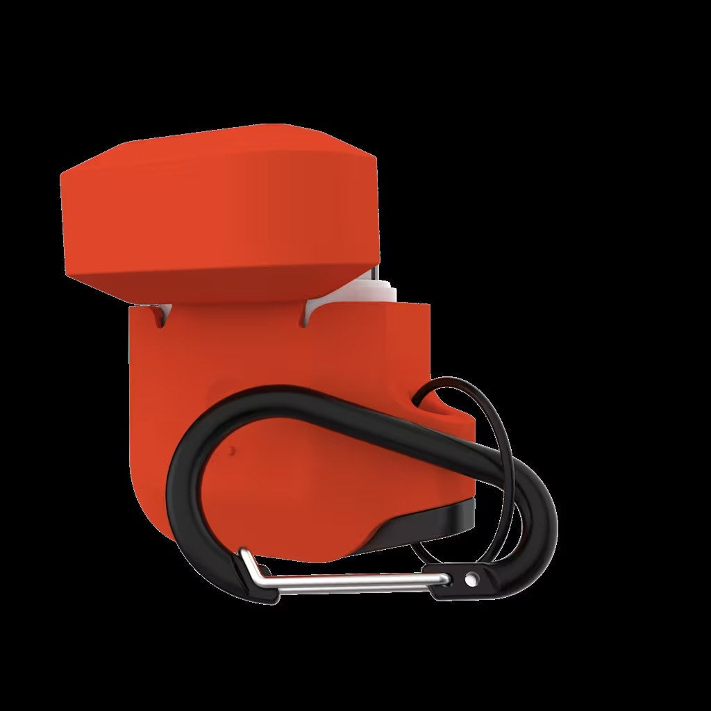 • Rugged weatherproof protection, detachable carabiner included, quick-release button to access your pods, lightning port & pairing button
